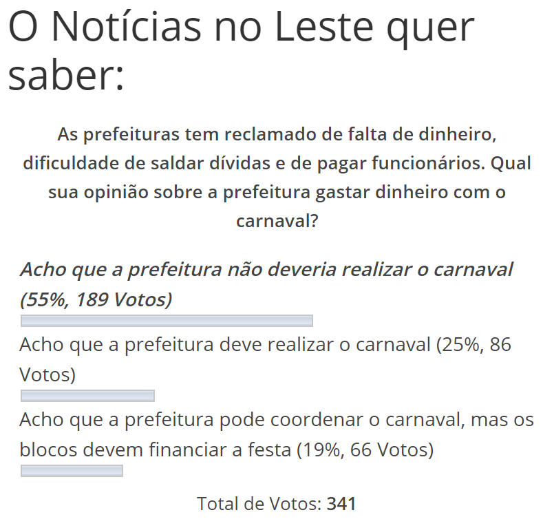 Dos 341 leitores do site, que opinaram, 189 (55%) disseram que se a prefeitura reclama de falta de recursos, ela não deveria realizar o carnaval em Conselheiro Pena.