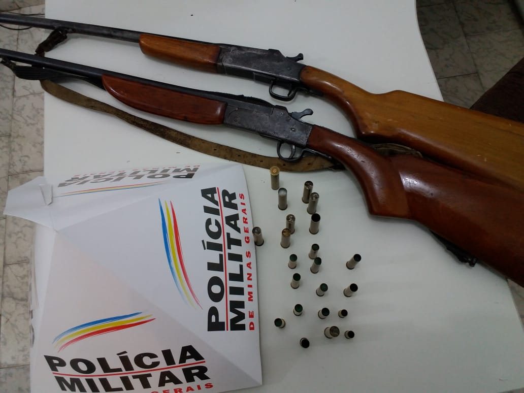 Goiabeira – A Polícia Militar apreendeu duas espingardas na zona rural de Goiabeira, no dai 05/09. D. G. F., 73 e W. G. F. 60, passaram pelos militares em fusca em direção ao Córrego Pedra Alta, abandonaram o veículo e subiram um morro a pé. Os militares foram ao encalço dos suspeitos e os flagraram de posse das armas de fogo uma calibre 36 e outra calibre 40.