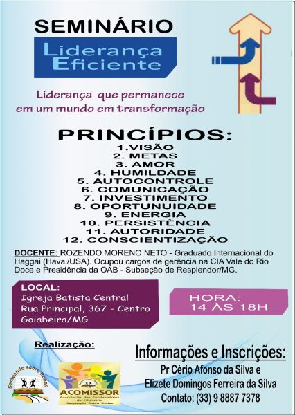 Eventos SEMINÁRIO – LIDERANÇA EFICIENTE – DIA 27 DE OUTUBRO – INSCRIÇÃO GRATUITA 18 de outubro de 2018 admin 0 Comentário acomissor, liderança eficiente, seminário, seminário em goiabeira