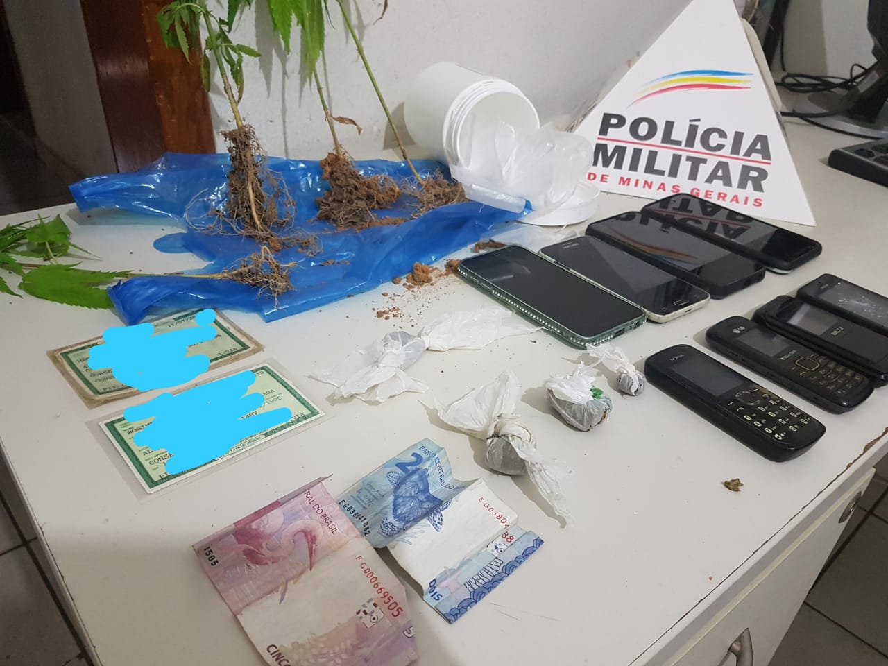 Os militares de Resplendor empreenderam esforços localizando o suspeito S. J., o qual constava contra ele um mandado de prisão em aberto. Em sua casa, foi encontrado no quintal 04 pés de maconha plantados 01 de maconha, 05 aparelhos celulares que foram recolhidos, tendo em vista que os militares consideraram haver indícios de uso whatsapp para a venda de drogas.