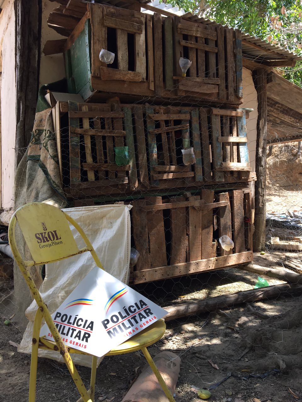 Quando os policiais chegaram ao local, encontraram 11 galos com sinais de maus tratos, esporas cortadas, e ainda uma arena de combate para rinha de galos.