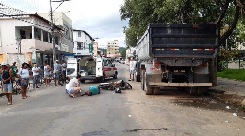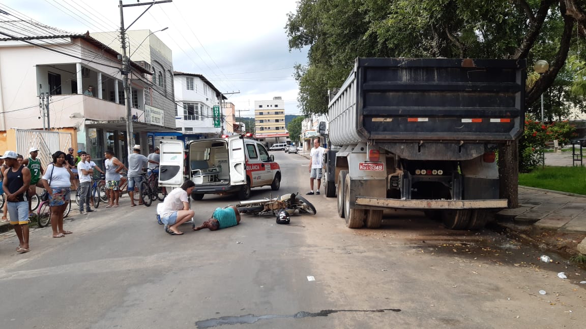MOTOCICLISTA BATE NA TRASEIRA DE CAMINHÃO ESTACIONADO NO CENTRO