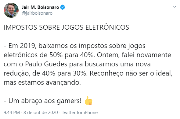 No dia 08/10, o Presidente da República Jair Bolsonaro mencionou, em sua conta oficial do Twitter, que conversou com o ministro da Economia do Brasil, Paulo Guedes, a respeito de abaixar os impostos sobre os jogos eletrônicos, que são extremamente altos em nosso país.