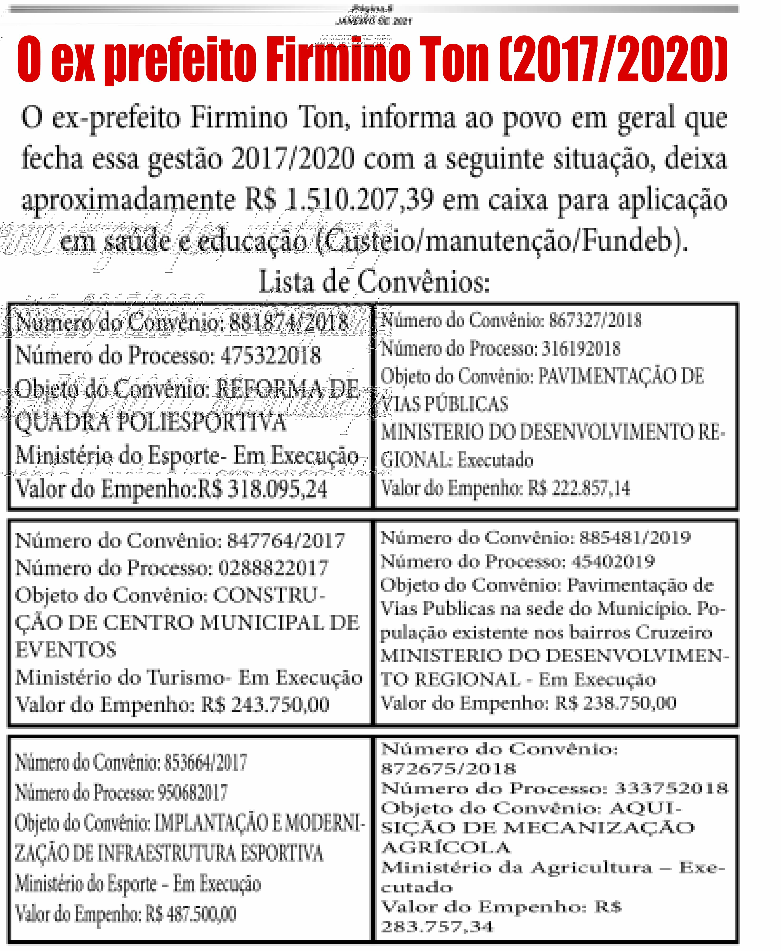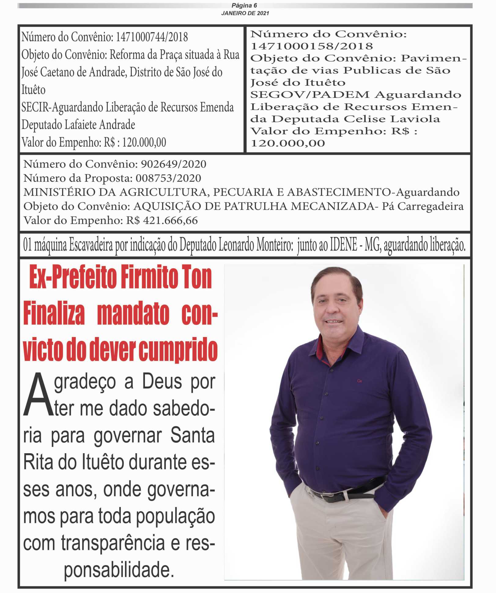 Parceiros EX-PREFEITO DE SANTA RITA DO ITUÊTO, FIRMINO TON, FINALIZOU MANDATO CONVICTO DE DEVER CUMPRIDO 5 de fevereiro de 20215 de fevereiro de 2021 admin 0 Comentário Informativo publicitário- Texto e fotos de inteira responsabilidade do autor Firmino Ton