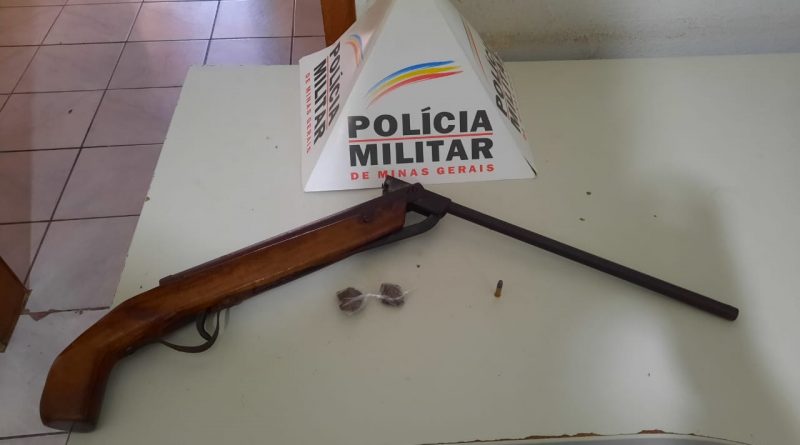 A Polícia Militar fazia uma batida policial no bairro, quando abordaram C.D.O.S. encontrando com ele 02 buchas de maconha. Na casa dele, os militares também encontraram uma espingarda calibre 22, carregada com um cartucho.