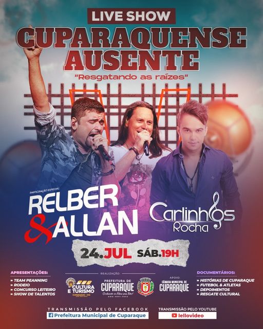 A Prefeitura Municipal de Cuparaque – ADM 2021/2024 por meio da Secretaria de Cultura e Turismo realizará no dia 24/07 a “Live Cuparaquense Ausente”.