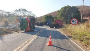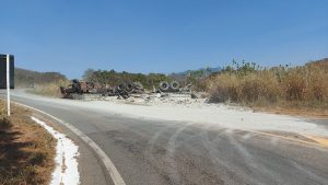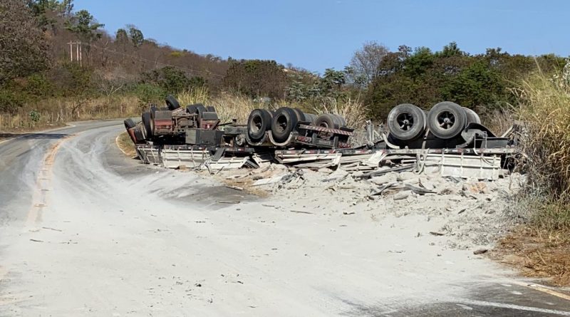 Um caminhão trator Mercedes Benz, com o dois semi-reboques, carregados de cimento havia perdido o controle descendo a serra para o travo invadido a contra mão e tombado.