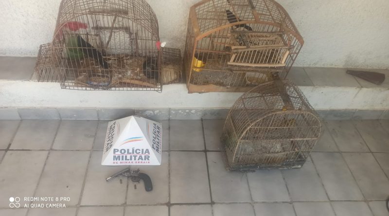 A Polícia foi acionada para verificar na zona rural, sobre um suspeito que estaria colocando fogo no pasto de sua vizinha. Quando os militares chegavam ao local, avistaram o homem que fugiu. Os policiais se posicionaram em um local estratégico e conseguiram aborda-lo. No local onde ele estava, os policiais encontraram 04 pássaros da fauna silvestre sem a devida documentação e no seu endereço já na cidade, após busca na residência, foi localizado no telhado da residência 01 Garrucha Calibre.32 com 02 munições intactas, sem documentos de posse.