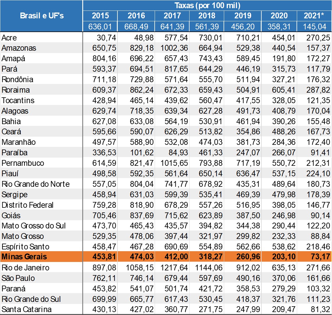 Segundo o cálculo, Minas tinha, em 2016, uma taxa de criminalidade de 474,03 por 100 mil habitantes, ocupando o sétimo lugar no ranqueamento nacional. No mesmo período, a taxa nacional equivalente era de 668,49. Em 2019, ao atingir o terceiro lugar no pódio de Segurança Pública, o estado apresentava uma taxa de 260,96 por 100 mil habitantes, enquanto o coeficiente brasileiro era de 358,51. E, finalmente, nos cinco primeiros meses de 2021, a taxa mineira é de 73,17, sendo a proporção em todo o Brasil de 145,04.