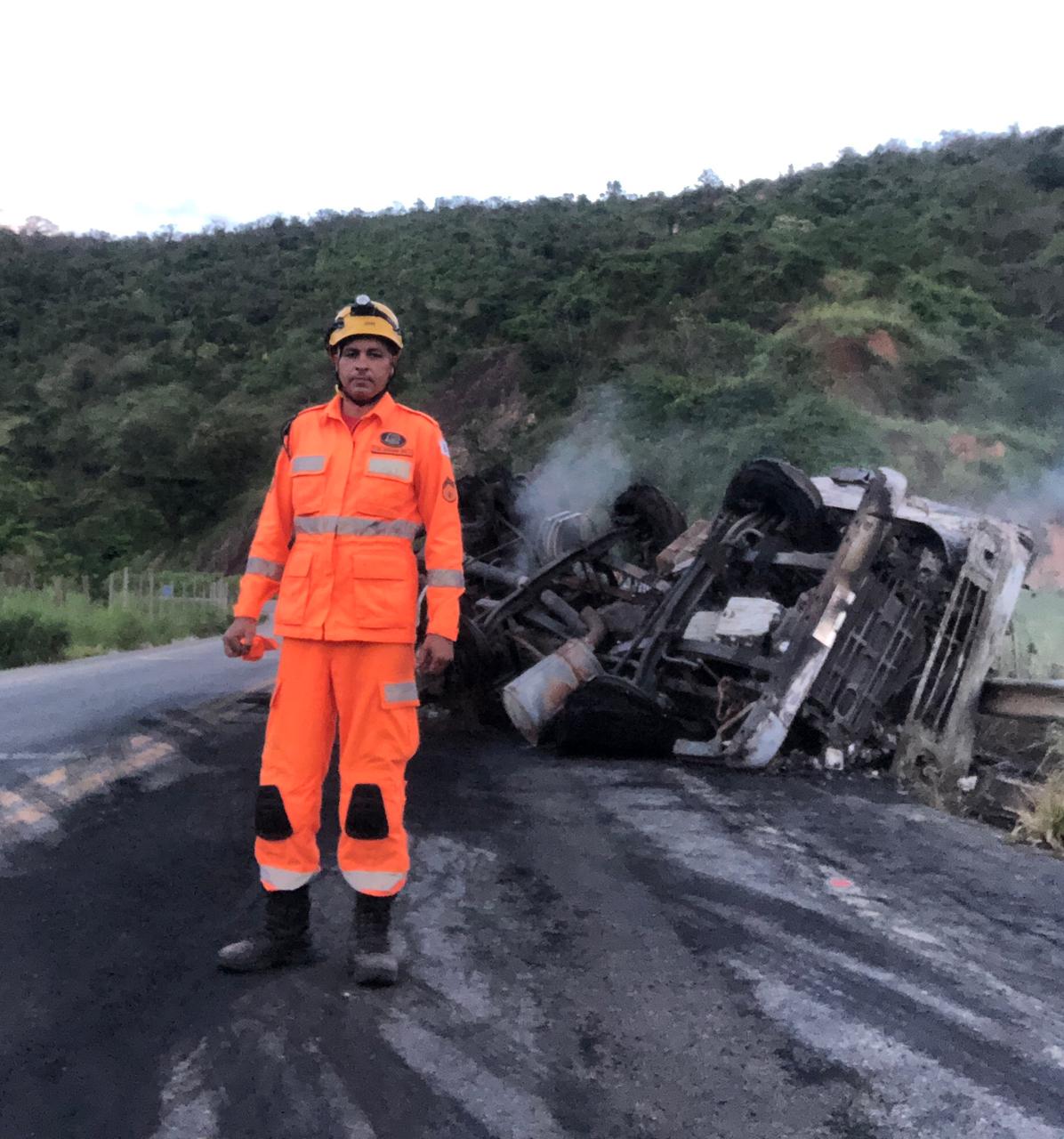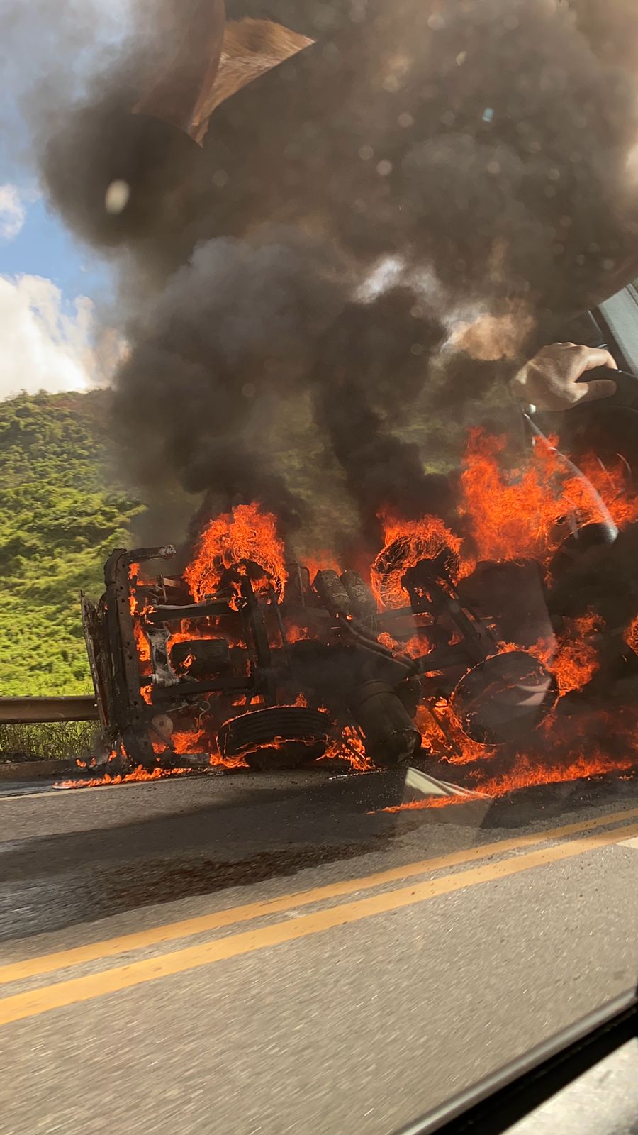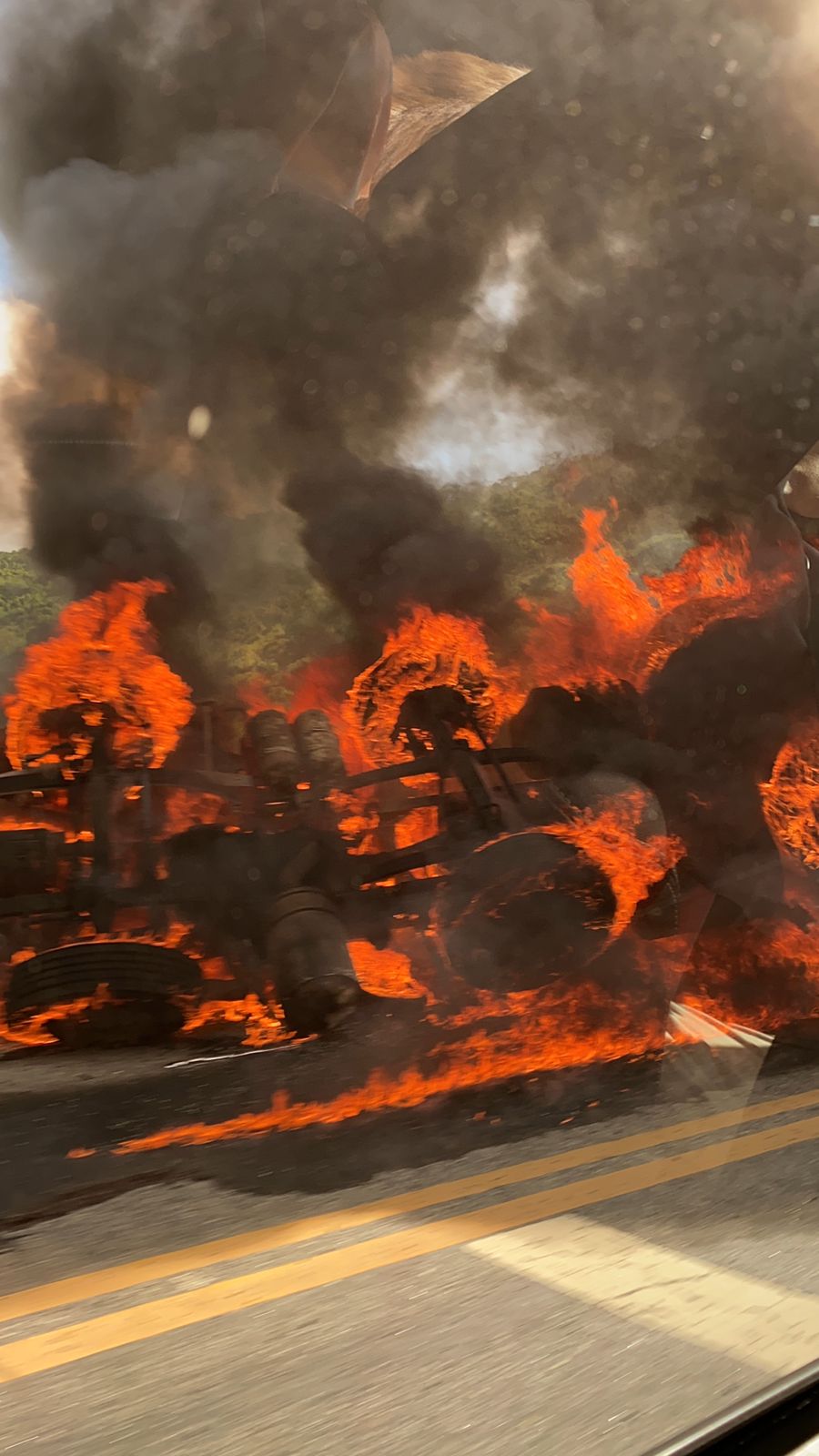 BR 259- Uma carreta que transportava café pegou fogo próximo ao km 21 da rodovia, no dia 15/01/2022, por volta das 8h30min.