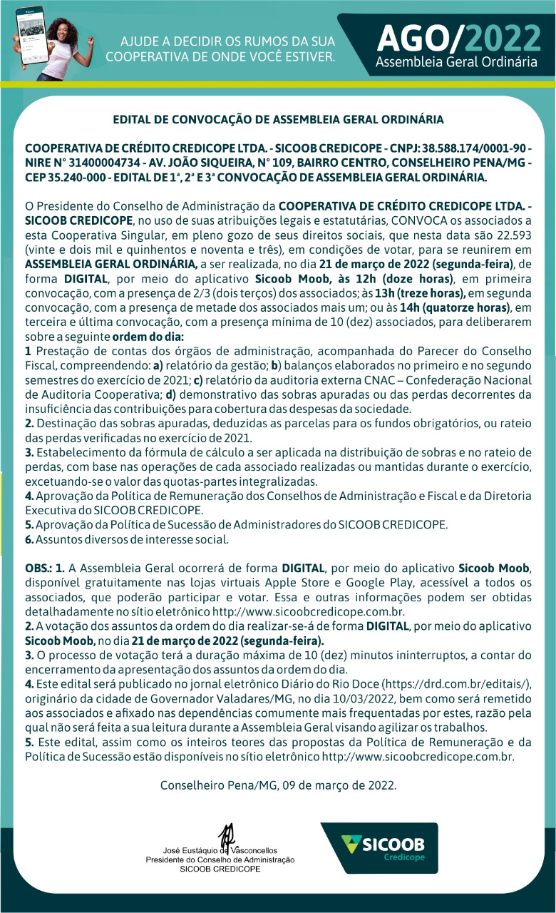 Eventos Parceiros COOPERATIVA DE CRÉDITO CREDICOPE LTDA. – SICOOB CREDICOPE – CONVOCA ASSOCIADOS PARA ASSEMBLÉIA GERAL ORDINÁRIA PARA O DIA 21 DE MARÇO 10 de março de 202210 de março de 2022 admin 0 Comentário Cooperativa de Crédito em Conselheiro Pena, CREDICOPE, Sicoob