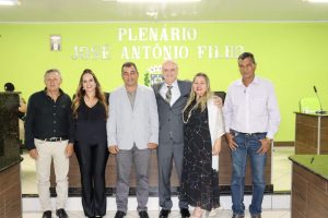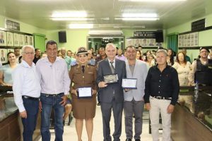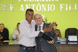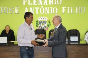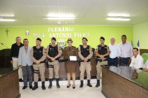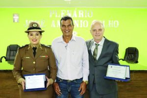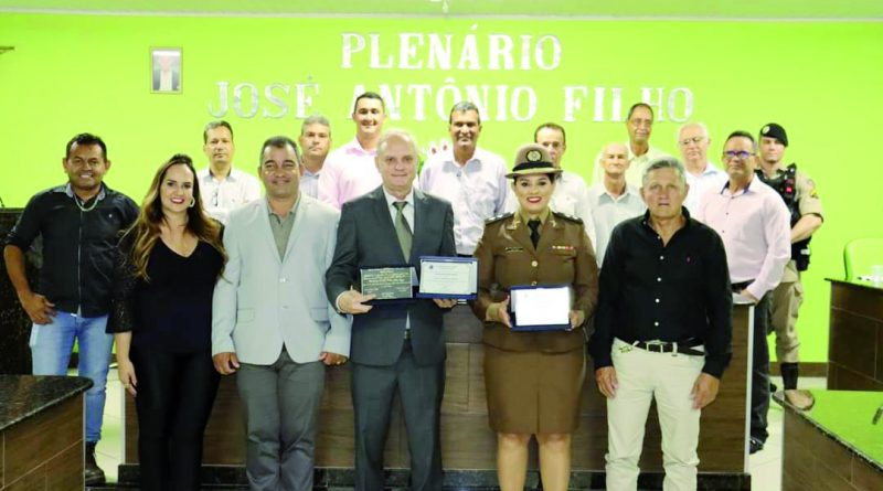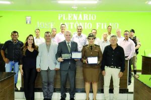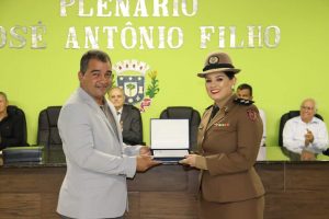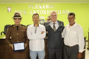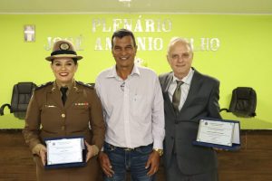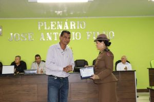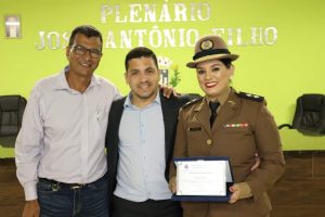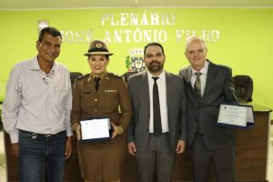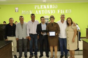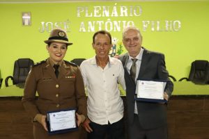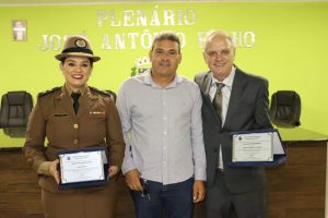 O Prefeito Samuel Ferreira fez, por determinação do Presidente vereador Duti, a entrega da placa de honraria à Sra. Tenente Thaís e o Título de Cidadão Honorário ao Dr. Willians Sueiro Mazega.