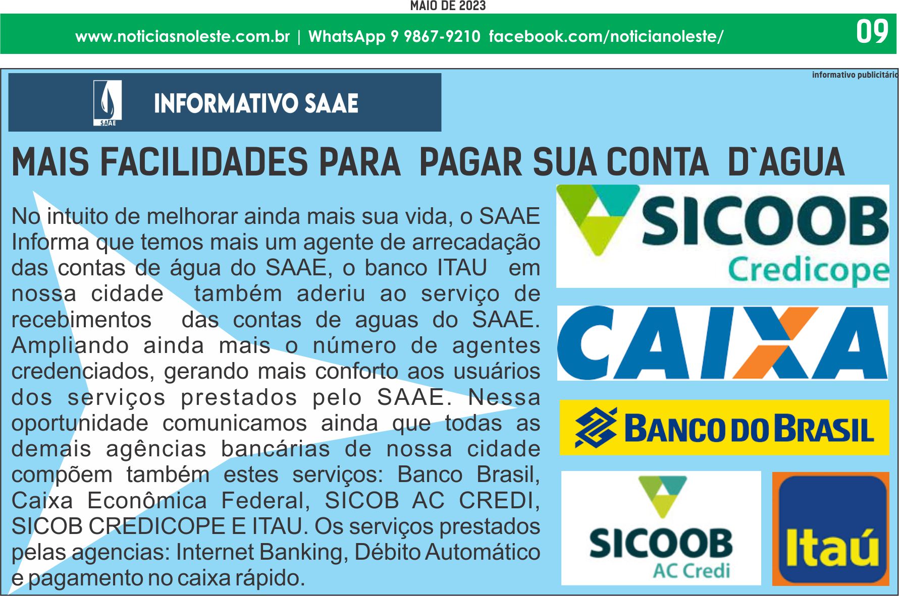Parceiros INFORMATIVO SAAE DE CONSELHEIRO PENA – MAIS FACILIDADE PARA PAGAR SUA CONTA D’ÁGUA 8 de maio de 20238 de maio de 2023 admin 0 Comentário