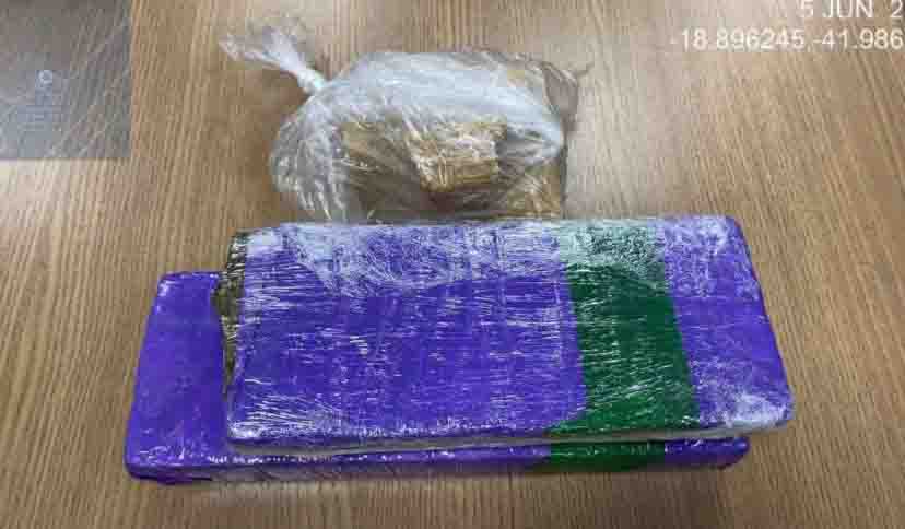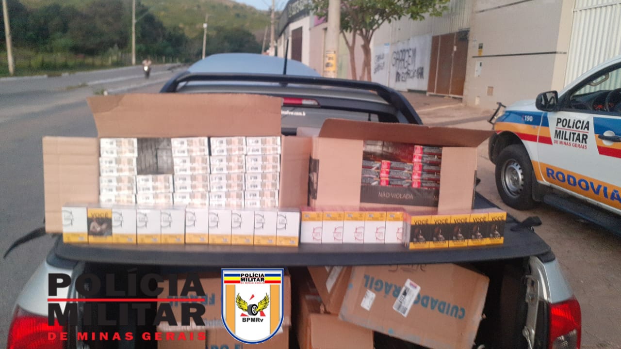 O motorista estava bastante nervoso, e nas buscas os militares encontraram dentro do veículo 02 barras de maconha, pesando aproximadamente 1 kilo e 485 gramas, 1 tablete de crack, pesando aproximadamente 485 gramas, e na carroceria do veiculo foram apreendidas 02 caixas de cigarro marca Gift contendo aproximadamente 1.000 mil maços de cigarro contrabandeados.
