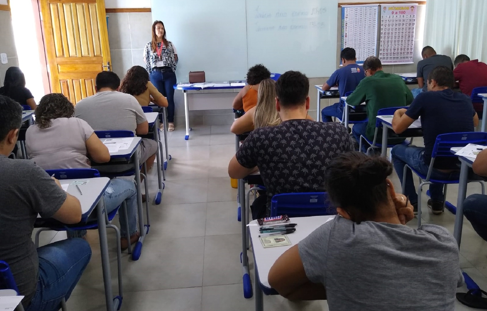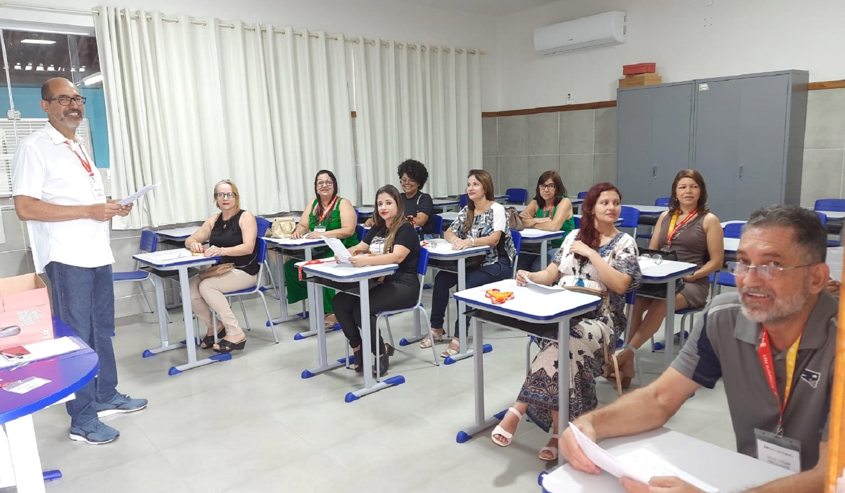 Foto: Reunião de treinamento com os fiscais aplicadores, todos professores da rede municipal de ensino, membros da comissão do concurso e representantes da empresa organizadora.