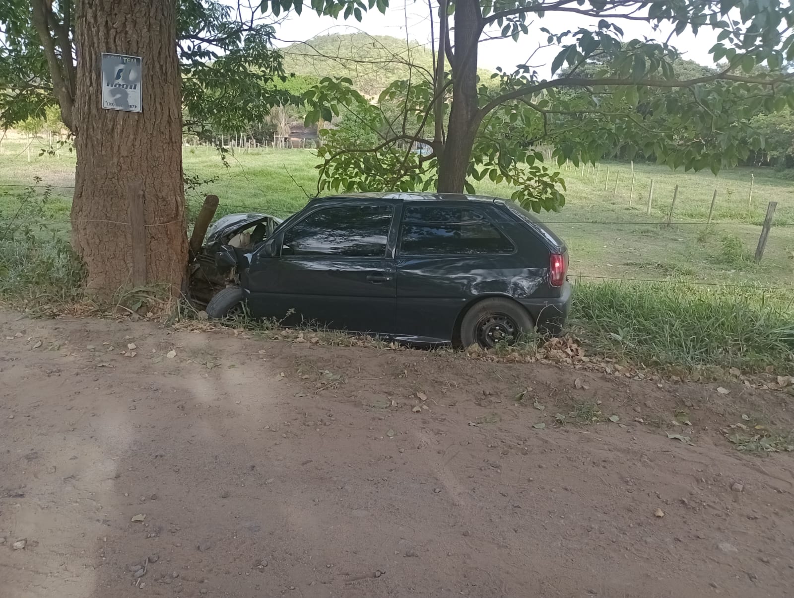 Quando a Polícia Militar chegou ao local, o serviço do SAMU sob o comando do Técnico de Enfermagem Lucas Vicente, já estava socorrendo o motorista do Gol, que não é habilitado, havia batido de frente com uma árvore no pasto próximo.