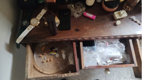 Foram apreendidos seis celulares que a polícia acredita conter informações sobre o tráfico de drogas, uma balança de precisão, dois relógios, uma porção grande de maconha, oito pedras de crack, um cigarro de maconha, uma pedra grande de crack que estava sendo picada para ser embalada, uma porção de cocaína que também estava sendo preparada, e ainda R$ 2.588,00, diversas sacolas de chup chup , que são usadas para embalar entorpecentes para serem vendidas, uma cartela contendo seis comprimidos de perfenol comumente utilizadas para misturas na preparação de cocaína, além de diversos cordões de prata e alumínio.