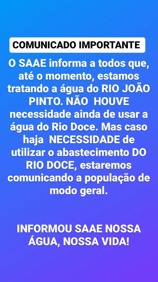 Notícias SAAE COMUNICA QUE NÃO ESTÁ CAPTANDO ÁGUA DO RIO DOCE – ABASTECIMENTO CONTINUA PELO CÓRREGO JOÃO PINTO 1 de fevereiro de 2024 admin 0 Comentário