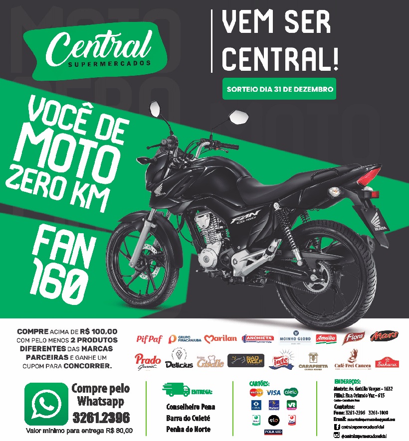 Notícias CENTRAL SUPERMERCADOS – VOCÊ DE MOTO ZERO KM – VEM SER CENTRAL ! SORTEIO DIA 31/12 6 de novembro de 2024 admin 0 Comentário