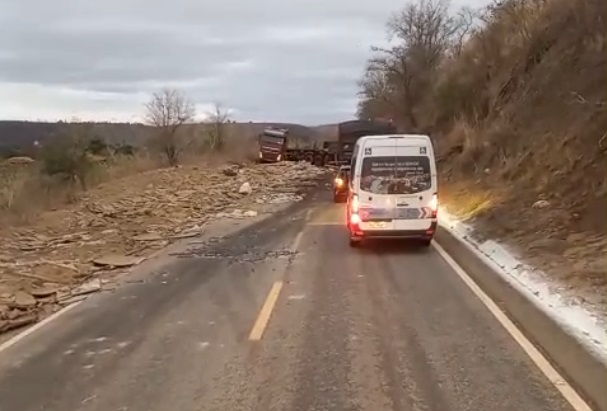 BITREM CARREGADO COM GRANITO TOMBA NA BR 259 E INTERDITA A VIA POR HORAS
