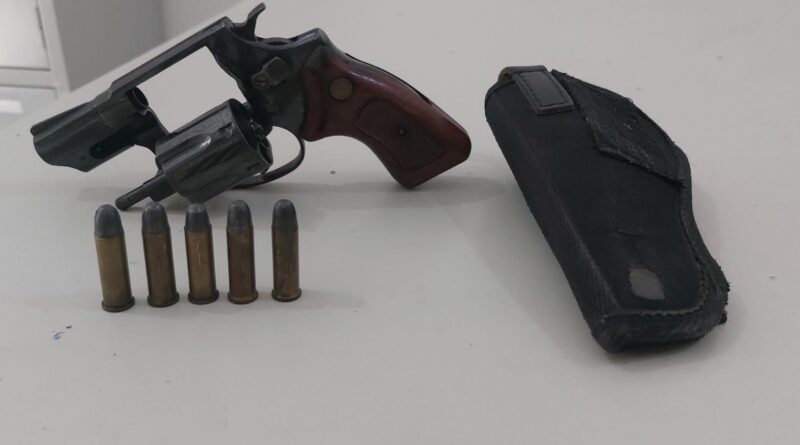 Em razão da atitude suspeita, foi realizada uma busca pessoal mais detalhada. No fundo da mochila que o suspeito carregava, a equipe encontrou um revólver calibre .38, municiado com 05 (cinco) munições intactas do mesmo calibre.