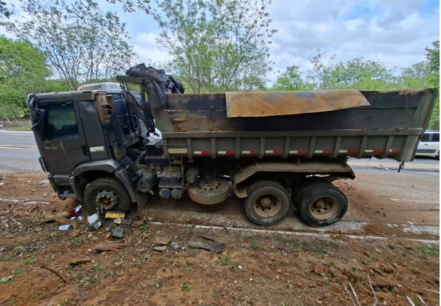 O impacto foi de tal magnitude que o caminhão caçamba girou e o Mercedes tombou. O cenário no asfalto era de caos: a cabine do Mercedes estava destruída e a carga, espalhada.