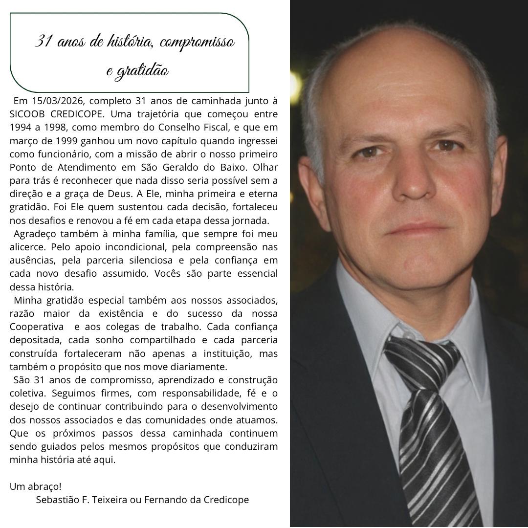 Em 15/03/2026, completo 31 anos de caminhada junto à SICOOB CREDICOPE. Uma trajetória que começou entre 1994 a 1998, como membro do Conselho Fiscal, e que em março de 1999 ganhou um novo capítulo quando ingressei como funcionário, com a missão de abrir o nosso primeiro Ponto de Atendimento em São Geraldo do Baixo. Olhar para trás é reconhecer que nada disso seria possível sem a direção e a graça de Deus. A Ele, minha primeira e eterna gratidão. Foi Ele quem sustentou cada decisão, fortaleceu nos desafios e renovou a fé em cada etapa dessa jornada. Agradeço também à minha família, que sempre foi meu alicerce. Pelo apoio incondicional, pela compreensão nas ausências, pela parceria silenciosa e pela confiança em cada novo desafio assumido. Vocês são parte essencial dessa história. Minha gratidão especial também aos nossos associados, razão maior da existência e do sucesso da nossa Cooperativa e aos colegas de trabalho. Cada confiança depositada, cada sonho compartilhado e cada parceria construída fortaleceram não apenas a instituição, mas também o propósito que nos move diariamente. São 31 anos de compromisso, aprendizado e construção coletiva. Seguimos firmes, com responsabilidade, fé e o desejo de continuar contribuindo para o desenvolvimento dos nossos associados e das comunidades onde atuamos. Que os próximos passos dessa caminhada continuem sendo guiados pelos mesmos propósitos que conduziram minha história até aqui.