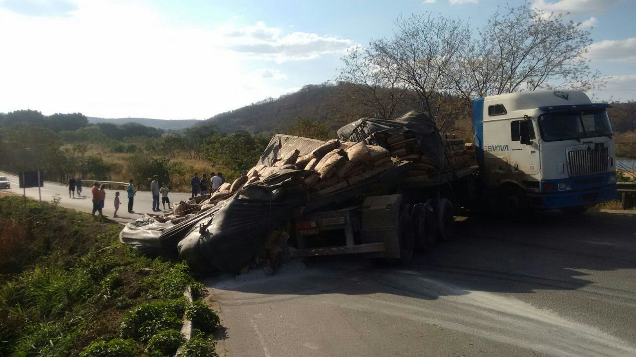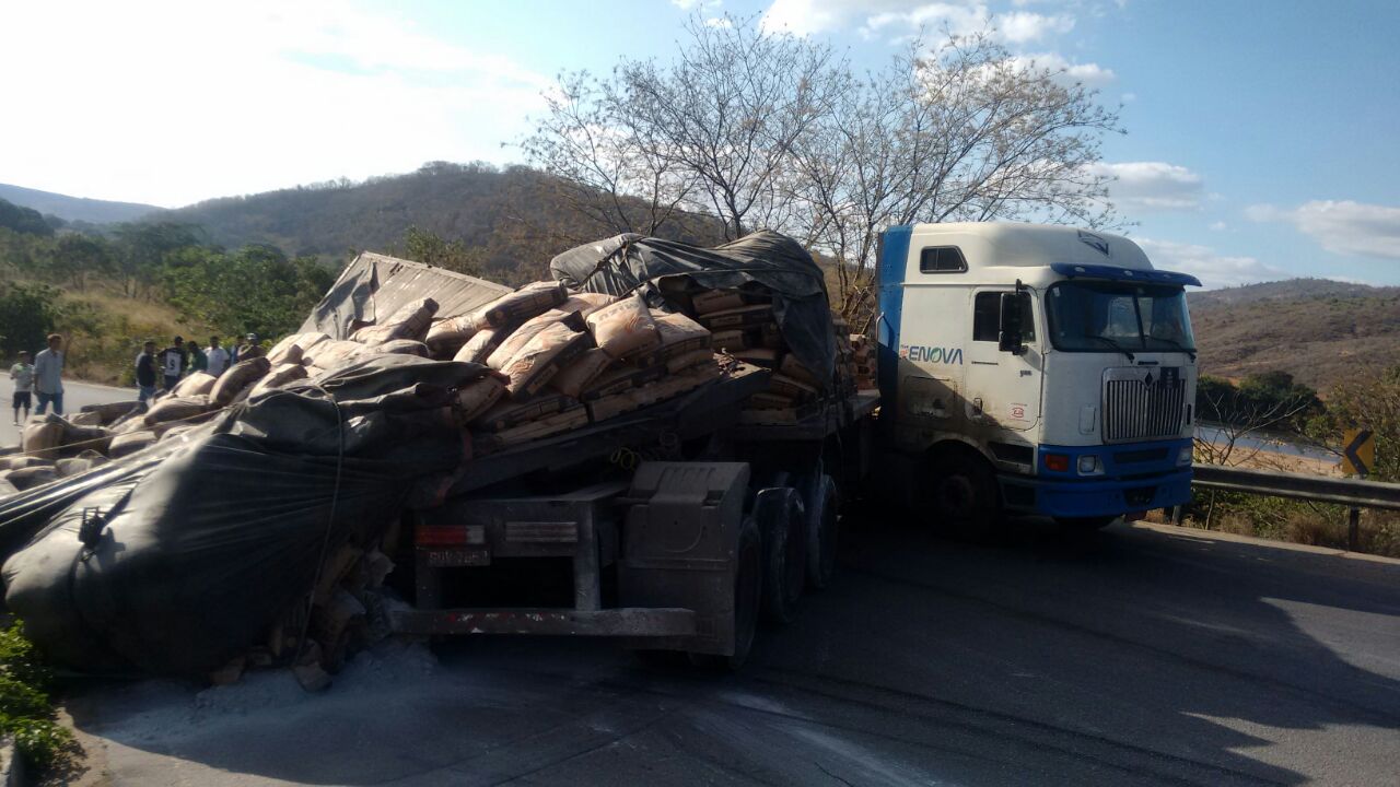 o Condutor não se feriu. Parte da carga está espalhada na rua.