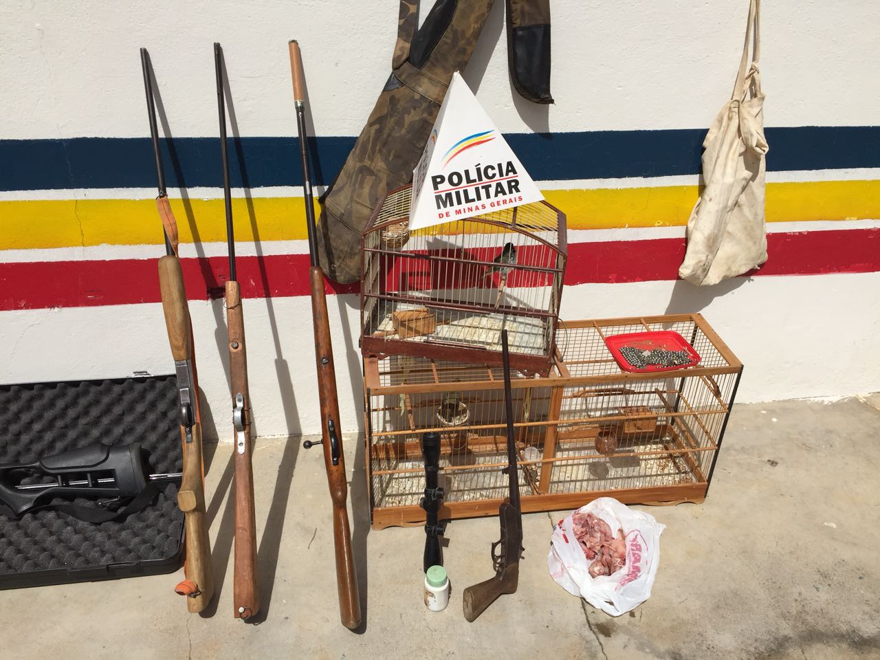 Os militares receberam denúncia anônima referente à prática ilegal de caça predatória, e foram até aquela vila, onde localizamos em uma primeira residência 2 espingardas cal. 22 e 40, alem de 265 munições calibre 22, 09 cal 40 e 01 cal.38.